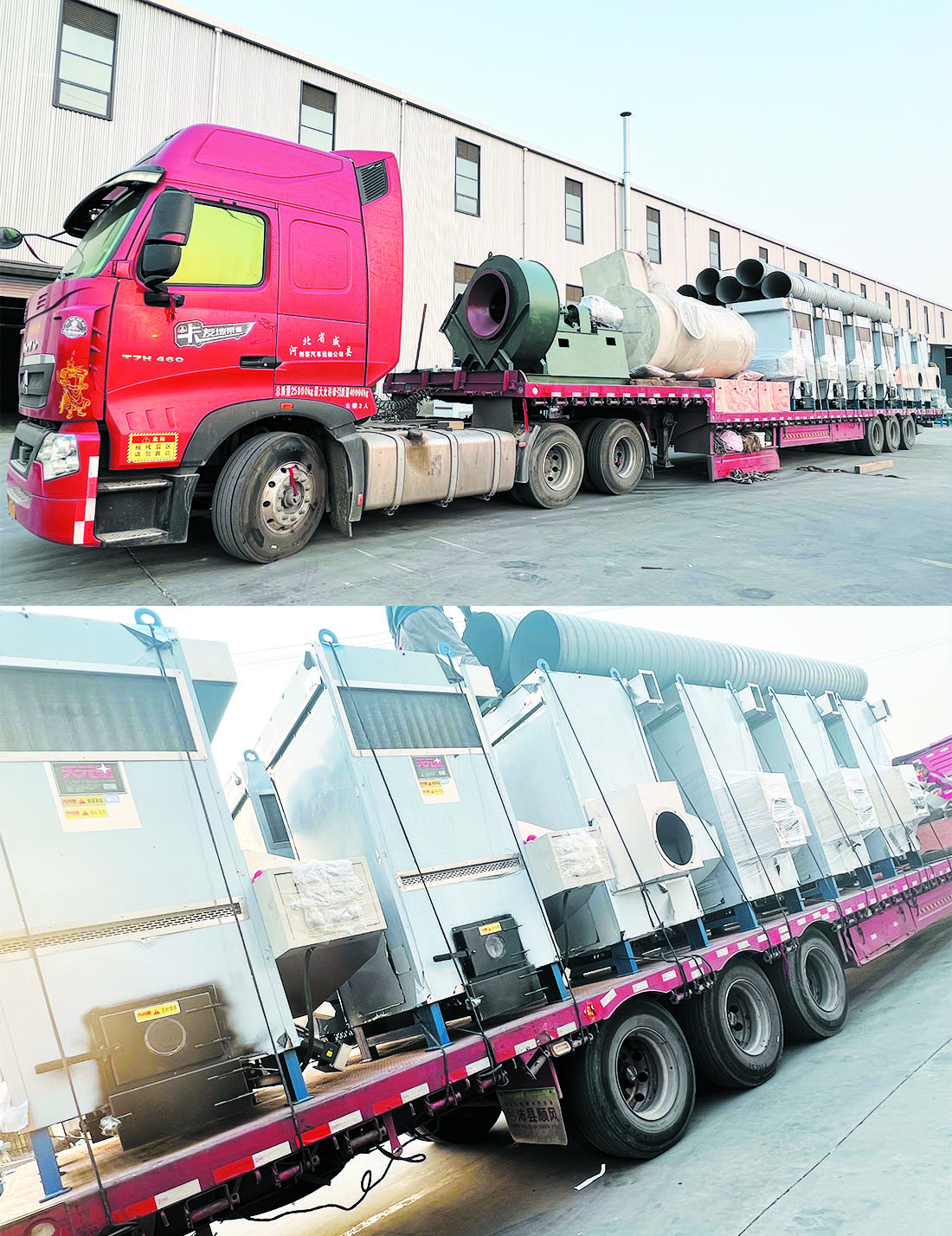 遼寧省錦州市新款生物顆粒熱風爐一體機(120型4右8左)12臺,30kw風機,水幕除塵器發(fā)貨